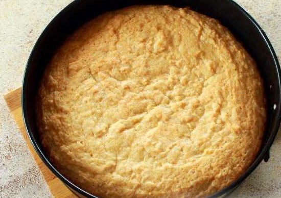 Cover the mold (I took a split one with a diameter of 26 cm) with parchment, grease with butter, lay out the dough and flatten.