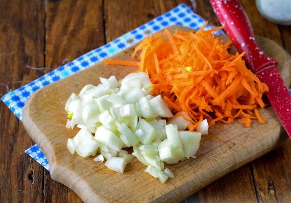 Pour half of the vegetable oil into a preheated pan. Fry the onion until transparent, about 3-4 minutes over medium heat, stirring occasionally. Add carrots to the onion. Fry the carrots and onions for a couple of minutes. Transfer the frying pan to a plate.
