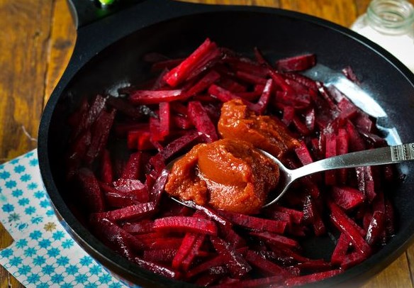 Fry the beets in the remaining oil for 2-3 minutes. Add tomato paste to the beets, you can pour in a couple of tablespoons of water. Pour in the vinegar, thanks to which the beets will retain their bright color and the borscht will acquire a beautiful burgundy hue. Simmer the beets for 5 minutes over medium heat.