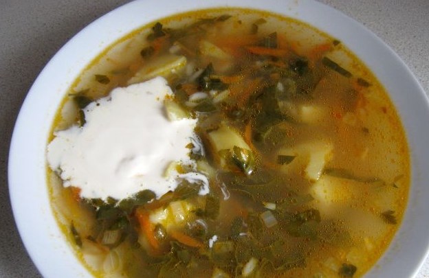 Such borscht can be cooked both in a meat broth and lean version. Ukrainian green borscht is delicious, especially with sour cream.