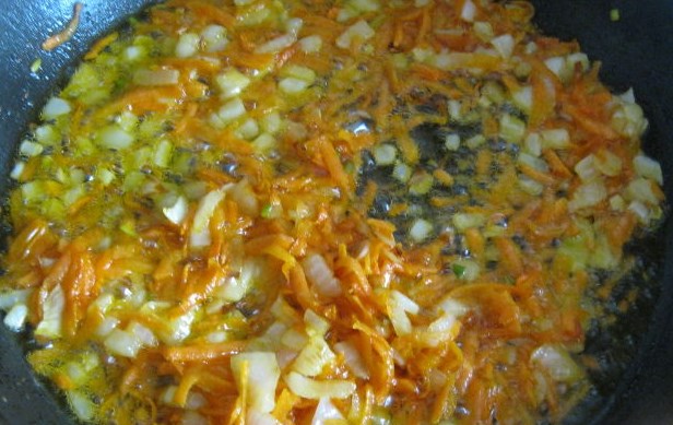 Preheat a frying pan, pour in vegetable oil. Fry, stirring occasionally, onions and carrots over medium heat for 2-3 minutes. Add tomato paste, mix well. The frying is ready.