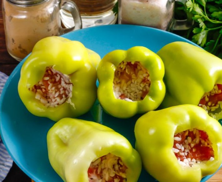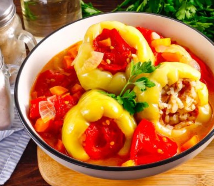 Bright and colorful stuffed peppers in Uzbek style are the perfect hot dish for lunch or dinner. The pepper is served along with the tomato sauce in which it was cooked and bread, so the dish is very satisfying.