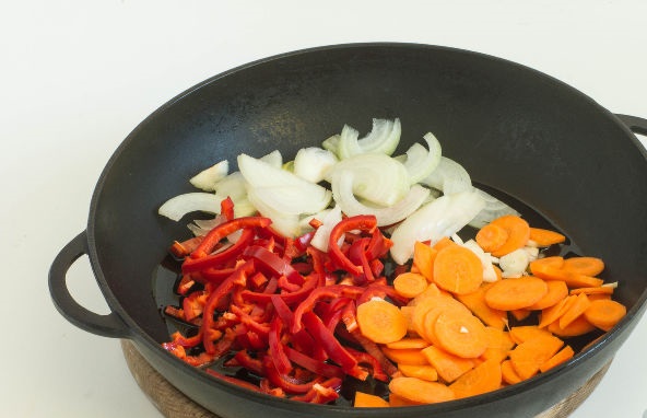 Heat vegetable oil in a skillet, put onions, peppers, garlic, and carrots.