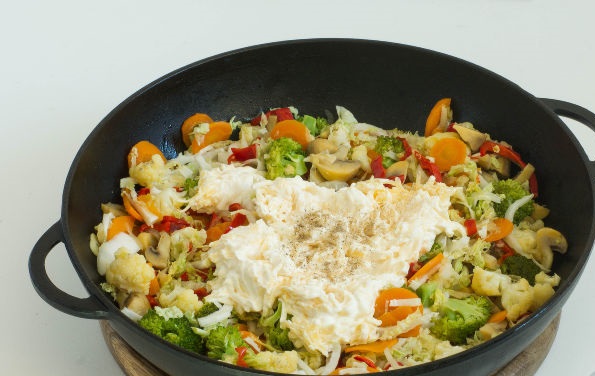 Peel and chop vegetables: onions and bell peppers – in half rings, carrots and garlic – in slices, mushrooms – in quarters (cut large into 6 parts), chop Chinese cabbage, broccoli, and cauliflower into inflorescences.