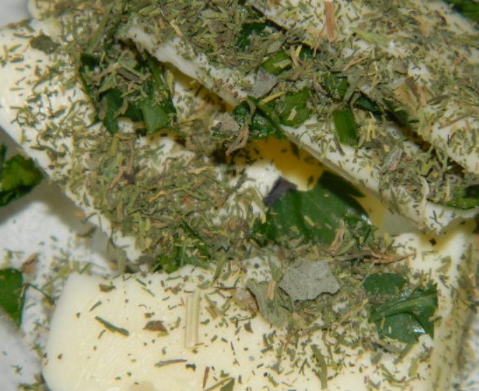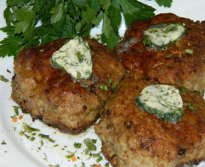 - First, beat the soft butter with chopped herbs and send to the freezer.