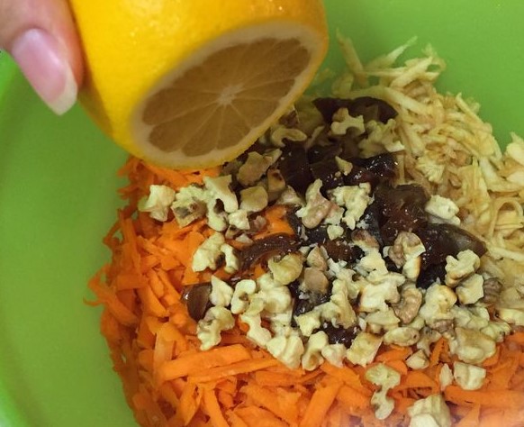 Squeeze 2 tablespoon of the remaining lemon. tablespoons of juice and carefully, so as not to get pits, add lemon juice to carrot salad with apples, nuts, and dates.
