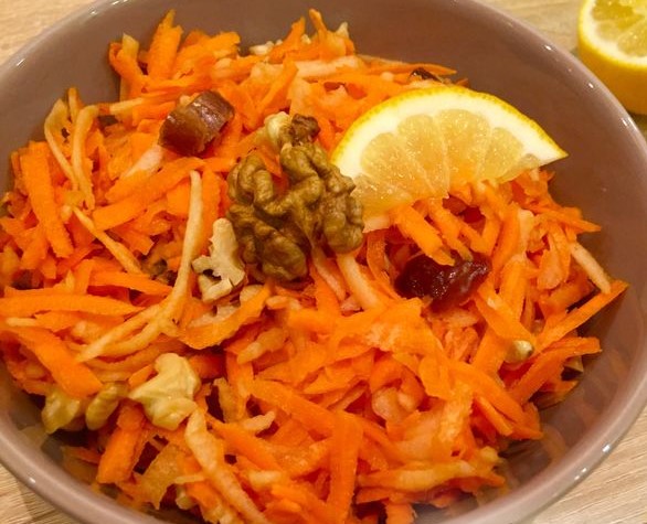 A simple recipe for a carrot salad. Fresh carrots and an apple, plus dates, walnuts, and a little lemon juice – this healthy salad cannot be called anything other than a vitamin.