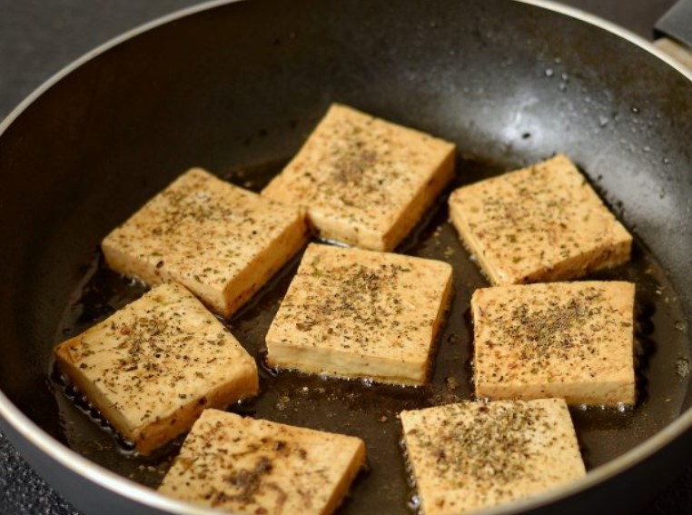Cut the tofu into slices. Dip in soy sauce, then sprinkle with Italian herbs and black pepper. Fry the tofu over medium heat until golden brown.