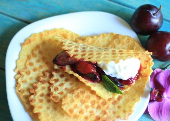 Put plum slices inside the waffle folded in half, you can add a little curd dessert.