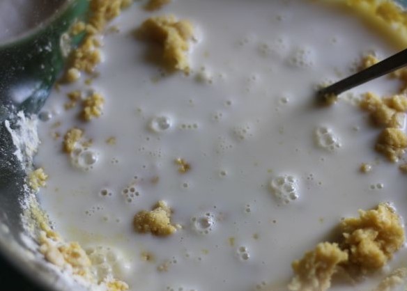Add milk and mix everything together with a whisk until a liquid dough piece is obtained.