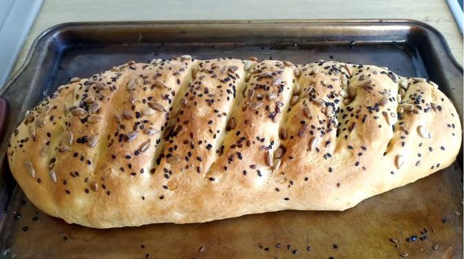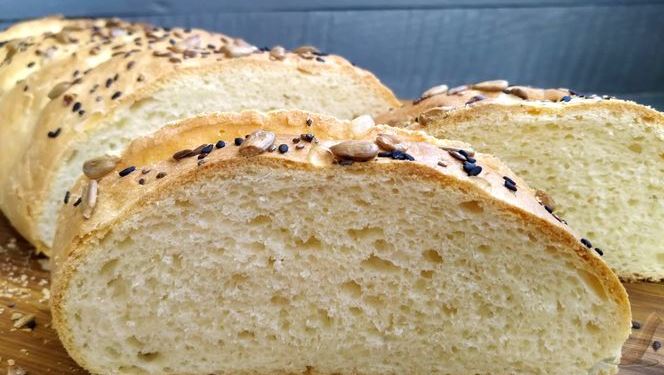 Then cool the finished loaf with seeds, cut it into slices, and serve. Soft, porous, fragrant, snow-white crumb and a ruddy, crispy crust – this homemade bread on kefir is perfect for sandwiches or a bowl of soup.