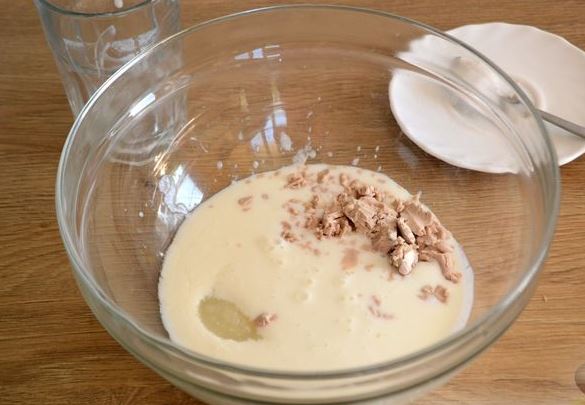 Warm the kefir slightly (to a temperature of 30-40 degrees) and crush the yeast into it. Add sugar, stir until yeast is completely dissolved, and leave for about 5-10 minutes. After the indicated time, the mixture should take on a small “cap” – this is a sign that the yeast has activated and is working.