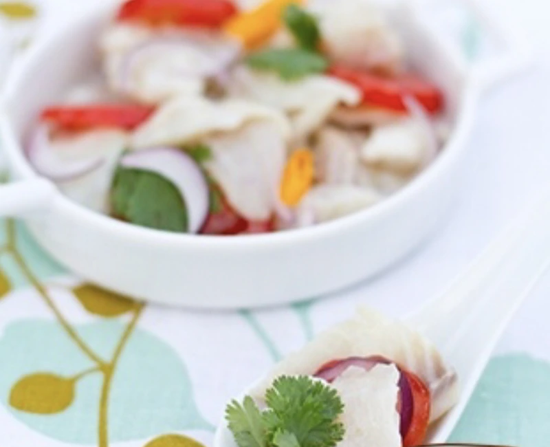 Ceviche is a fish or seafood dish, whose homeland is Peru. The original ceviche recipe consists of finely chopped raw fish of various types, marinated in lime juice for 15 minutes. Due to the citric acid content in lime juice, the proteins contained in the fish are denatured.