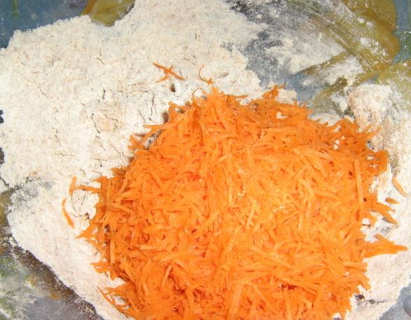 We dilute yeast and sugar in warm milk. Add to flour. Add vegetable oil. Stir with a fork. Add carrots. We mix. Add cheese, mix again.