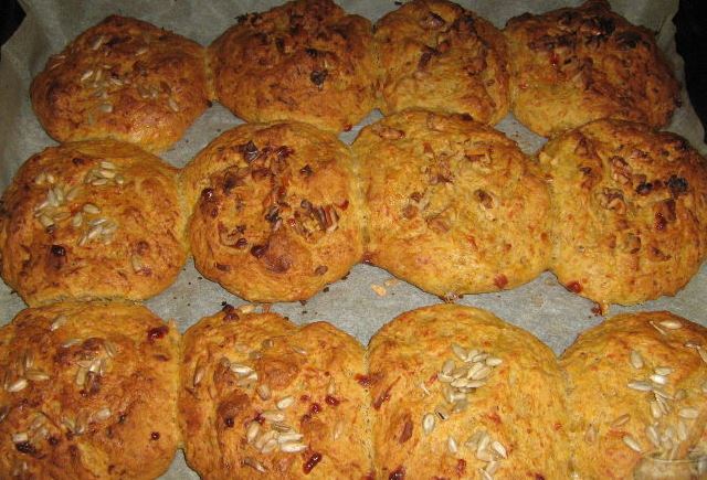 Grease each bun with milk. Sprinkle half with peeled seeds, half with chopped walnuts. You can also use sesame seeds, pumpkin seeds, and almonds. In general, as always, what you love or what is at hand.