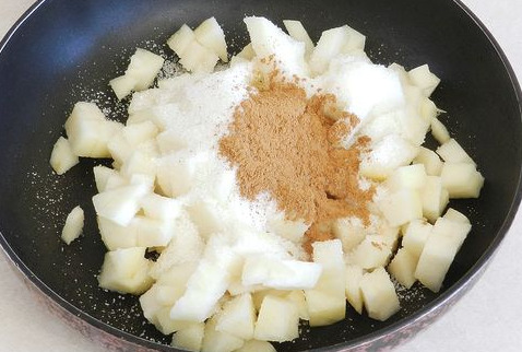 Put the chopped pear into the pan, add 2/3 of the total sugar, add cinnamon.