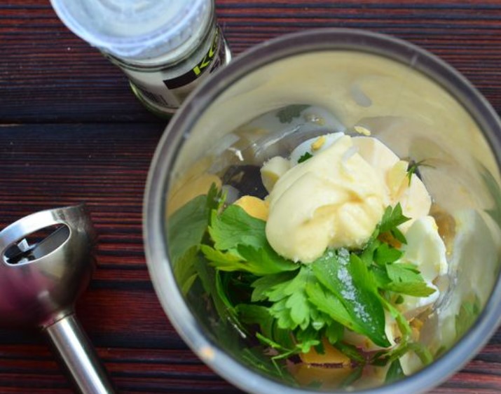 Grind all ingredients with a blender into a homogeneous paste. Thanks to the parsley, the pasta turned green. Add some salt to taste.