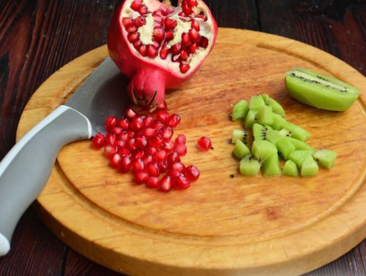 Prepare pomegranate seeds to decorate “Christmas trees”. Peel half of the kiwi and cut into small cubes.