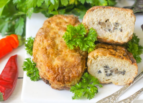 Put the finished minced meat zrazy with mushroom filling on a plate, garnish with fresh herbs and serve hot to the table. Enjoy your meal!