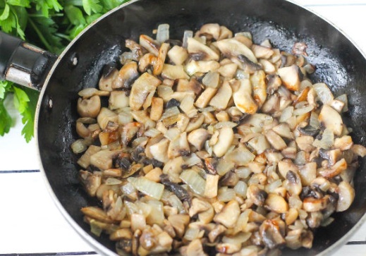 Preheat a frying pan, pour 30 ml of vegetable oil, heat it, and fry the onions in oil for 2-3 minutes, until transparent. Add the mushrooms to the onion and lightly salt to release the mushrooms. Fry for 10 minutes until golden brown.