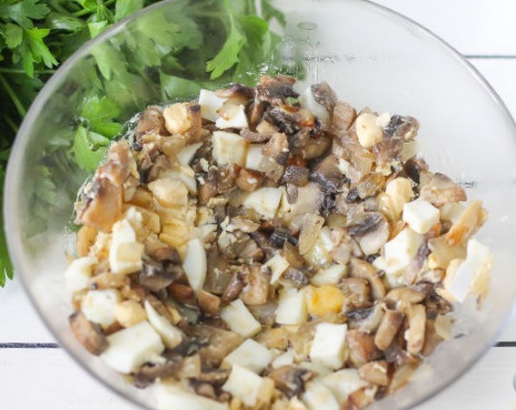 Peel the boiled eggs and cut them into small cubes. Add fried mushrooms and onions to the eggs, 1 pinch of salt, and stir gently. The filling for the zraz is ready.