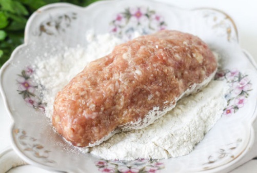Gently pinch the edges of the tortilla to form a stuffed oblong patty. Thus, make all the minced meat zrazy with mushroom filling (if desired, they can be frozen at this stage). Dip the zrazy in sifted flour.