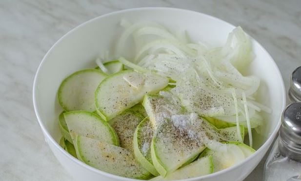 Put onion and zucchini in a bowl, salt, and pepper to taste. Add vegetable oil and mix. Cut the cheese into slices.