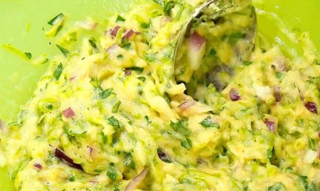 Salt the grated zucchini and squeeze out the excess liquid in a convenient way. Put the squeezed zucchini into a bowl in which we will prepare the dough. Add the other half of the chopped onion to it.