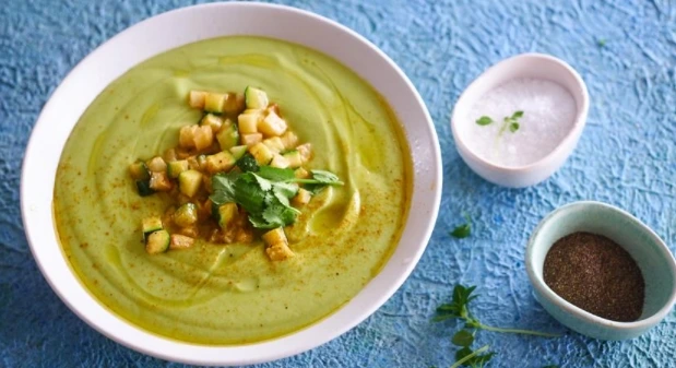 The creamy zucchini and celery soup will go very well with large pieces of rustic white bread baked with olive oil and greased with sun-dried tomato pesto.