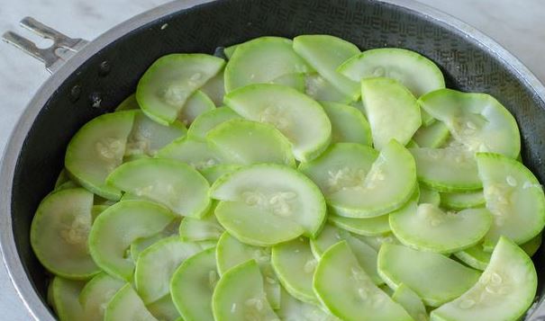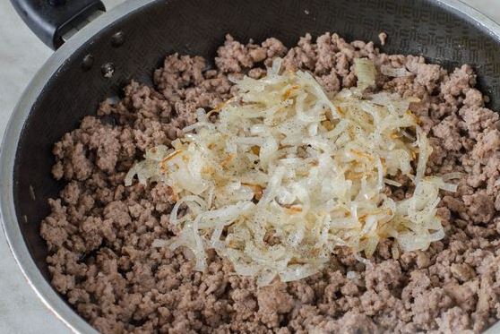 Pour boiling water over the zucchini, salt and boil for 5 minutes. Then we put it in a colander. Return the onion to the minced meat, salt, and pepper. We warm-up for a minute.
