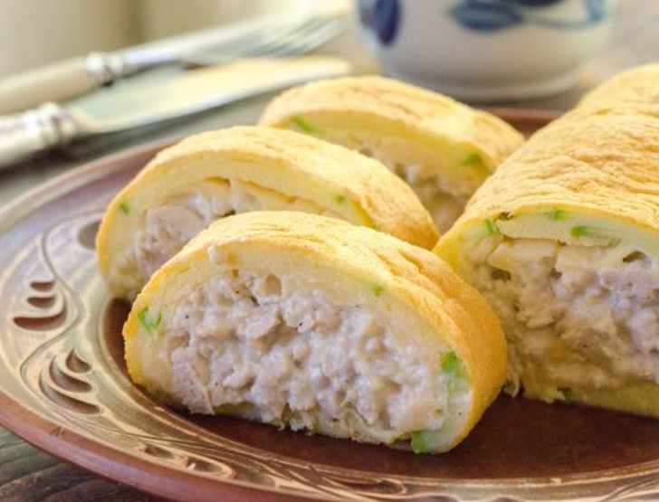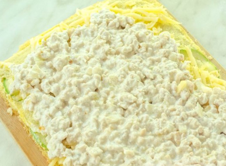 Let the finished roll cool. Zucchini roll with minced chicken is ready.