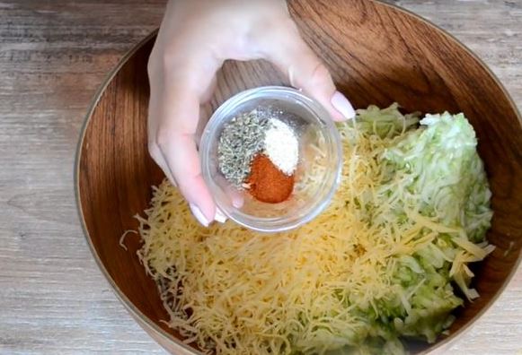 We squeeze the zucchini well from excess liquid, add eggs and flour, half of the grated cheese, spices. Knead the dough to a consistency similar to pancakes.